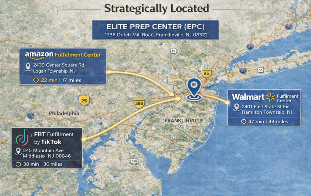 Elite Prep Center operates a strategically located warehouse in New Jersey, within one hour of major Amazon, Walmart, and TikTok fulfillment centers across the Northeast corridor, enabling faster fulfillment and lower shipping costs.